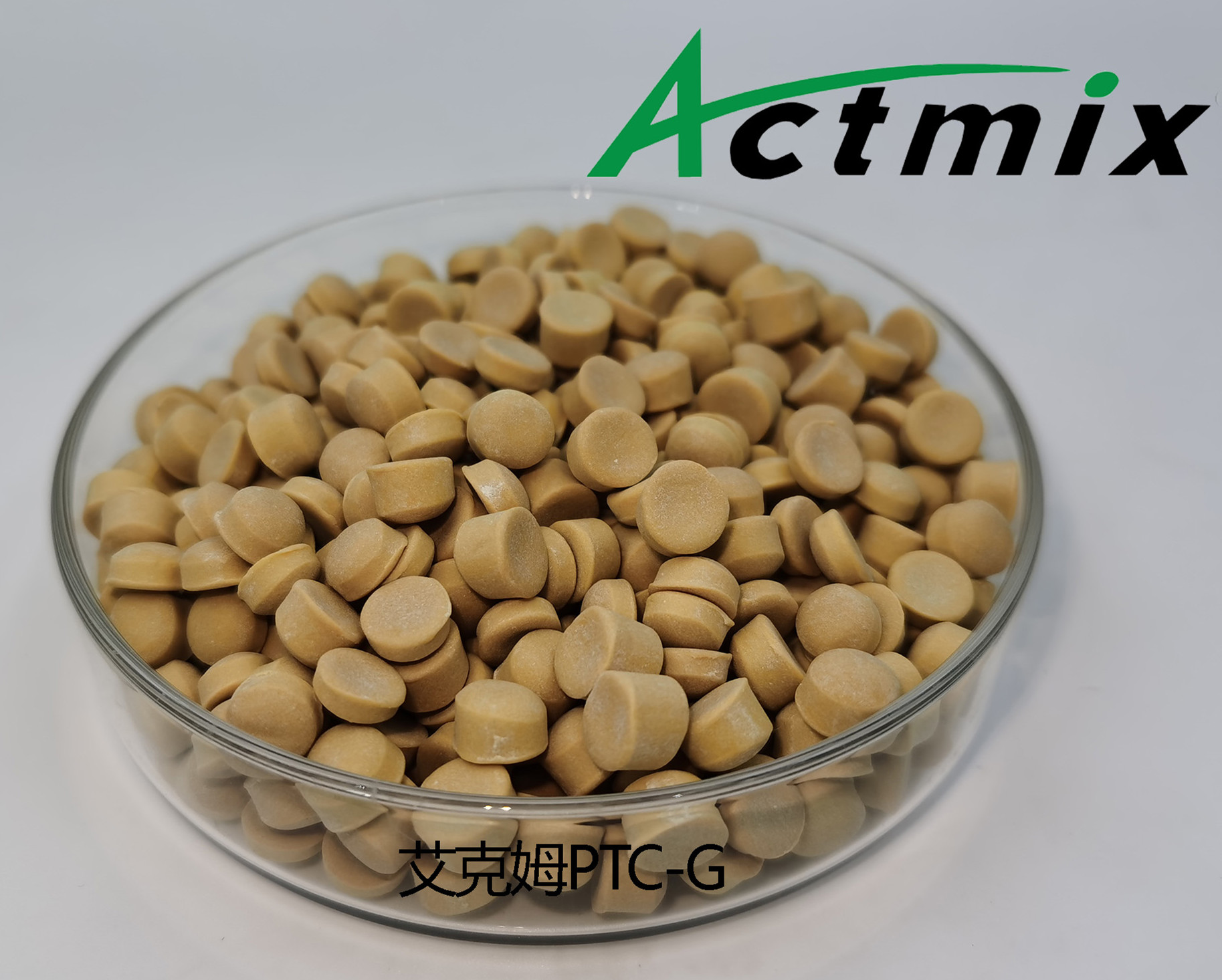 Actmix PTC-G是一种由N,N'-间苯撑双马来酰亚胺、次磺酰胺类和秋兰姆类促进剂组成的复合硫化剂,与硫磺并用硫化二烯类橡胶,如天然橡胶、丁苯橡胶、合成异戊橡胶等。具有延长焦烧时间、胶料的耐热性好、抗硫化返原性好、压缩永久变形小以及与浸胶帘线粘合强度高的优点。